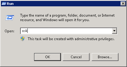 To launch the on-screen keyboard in Windows Server, go to Start -> Run and type osk into the dialog box.